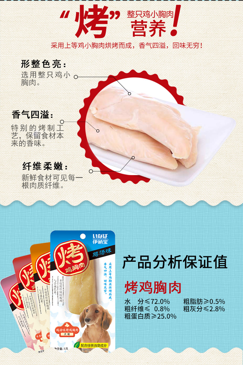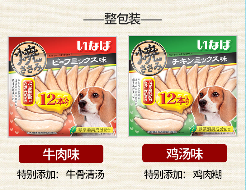 【自营】日本INABA伊纳宝 犬用狗零食 烤鸡胸肉 洁齿磨牙肉条 营养狗狗肉条 12条装 鸡汤味