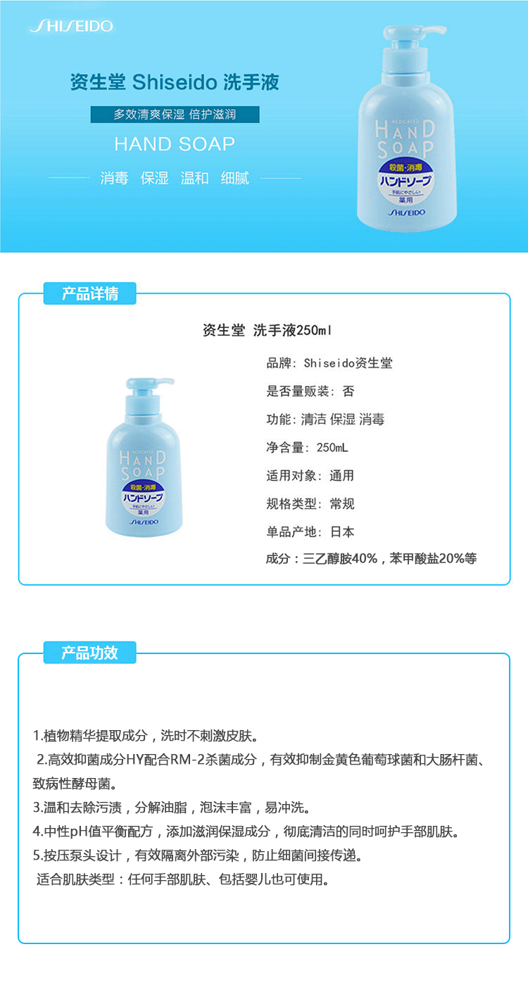 【自营】日本SHISEIDO资生堂 多效温和洗手液 倍护滋润 清洁保湿 250ml