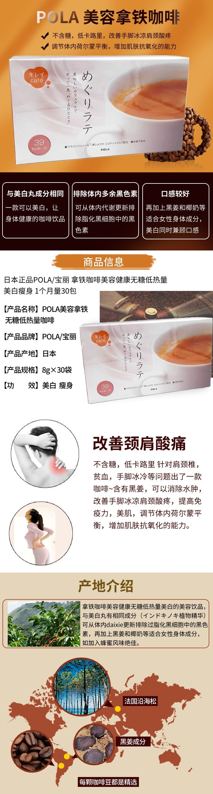 【自营】日本POLA宝丽 美容美白无糖低热量拿铁咖啡 1月量 30包入